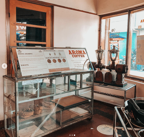 Kopi Aroma dikenal sebagai salah satu merek kopi yang legendaris di Bandung. Usaha kopi ini dimulai pada tahun 1930-an oleh Tan Houw Sian yang membuat kopi dengan cara yang sangat tradisional. Metode pengolahan kopi ini masih terus dipertahankan hingga saat ini di bangunan yang sama. Proses roasting biji kopi di sini menggunakan mesin buatan Jerman yang usianya sudah 90 tahun. Di sini Anda bisa menikmati secangkir kopi hangat yang diseduh langsung, juga membawa pulang bubuk kopinya untuk dinikmati di rumah.